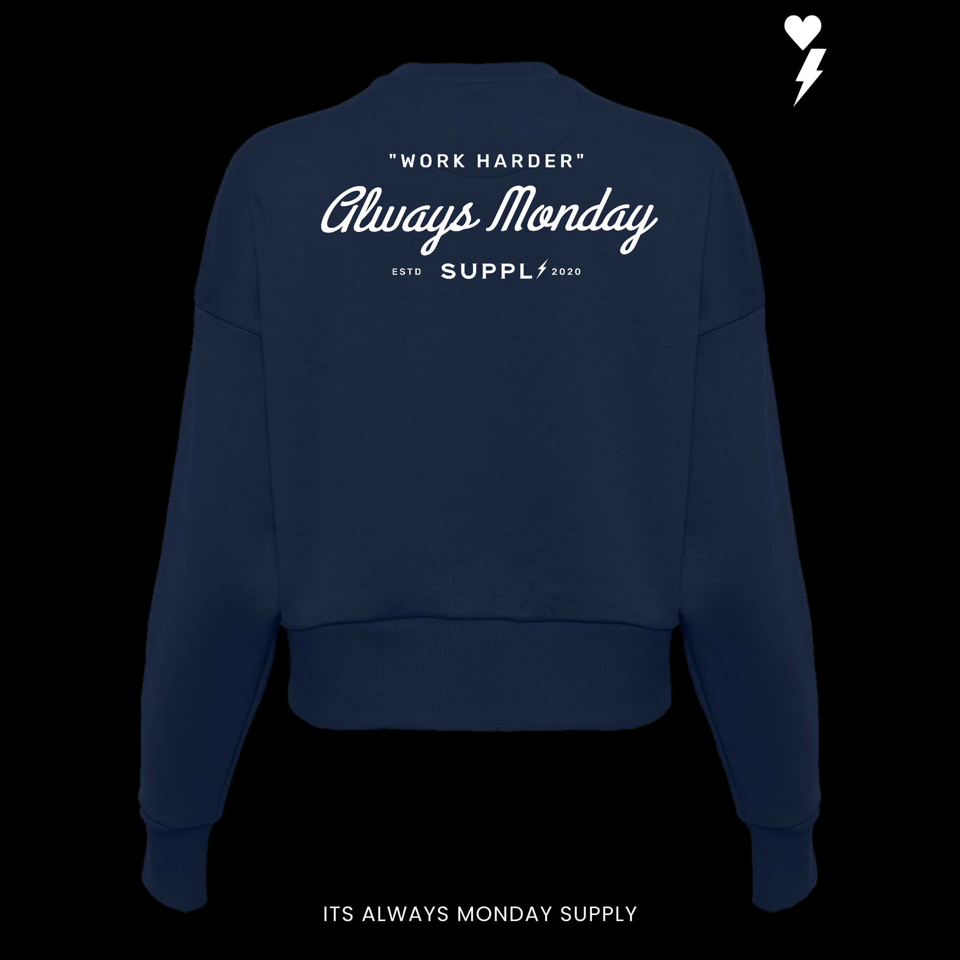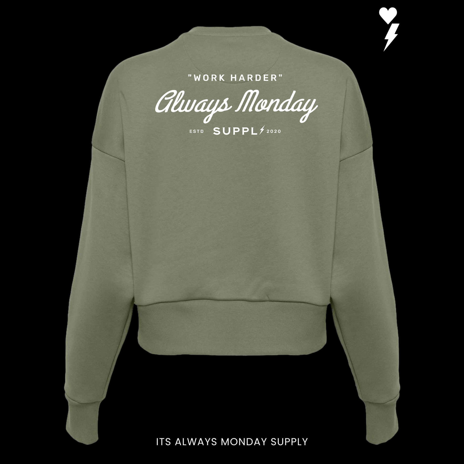 Up front, It’s Always Monday makes a quiet but confident statement. On the back, Work Harder speaks louder — paired with our OG heart and lightning graphic, symbolizing passion, pressure, and the power of showing up every single day.