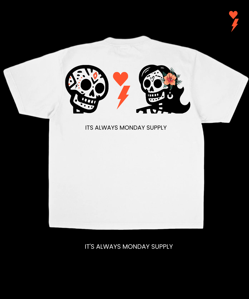 This It’s Always Monday Supply tee puts a spooky spin on married life. Featuring a skeleton husband and wife facing each other with a heart-and-lightning spark between them, it’s a tribute to love, laughter, and surviving another Monday together. Perfect for couples who know that Mondays may be eternal, but so is their grind (and their love).